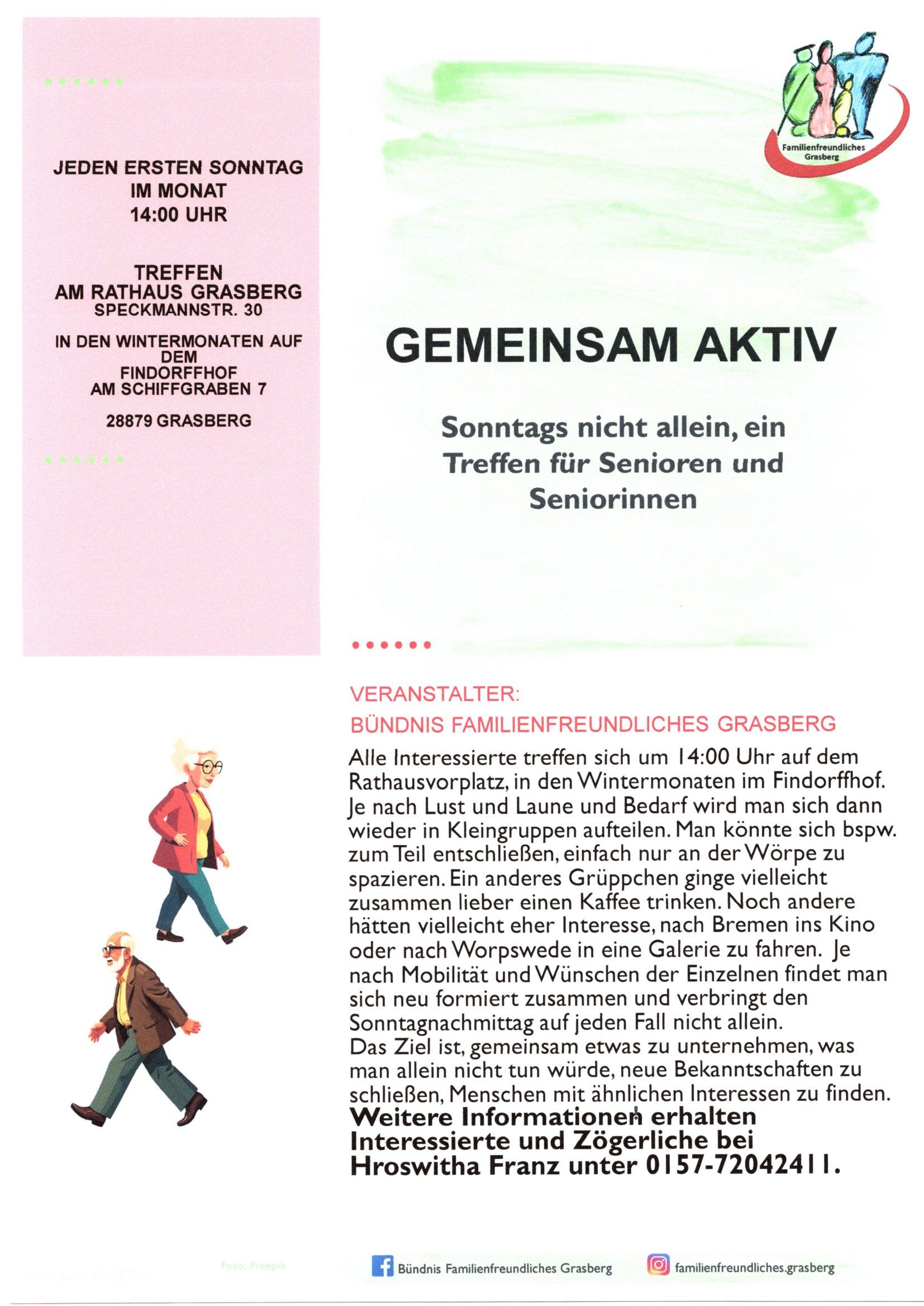 Senioren und Seniorinnen haben am ersten Sonntag des Monats die Möglichkeit, sich um 14 Uhr auf dem Rathausvorplatz (in den Wintermonaten im Findorffhof) einzufinden, um andere Menschen zu treffen, die dann gemeinsam oder in Gruppen ad hoc Aktivitäten für den Nachmittag planen.