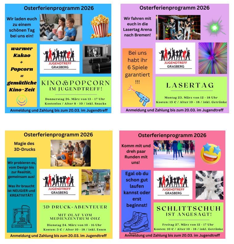 Der Jugendtreff ist die kommunale Einrichtung für Kinder und Jugendliche in Grasberg. Es bietet euch die Möglichkeit, hier eure Freizeit zu verbringen, Freundschaften zu schließen, gemeinsame Aktionen zu erleben und Euch auszutauschen.