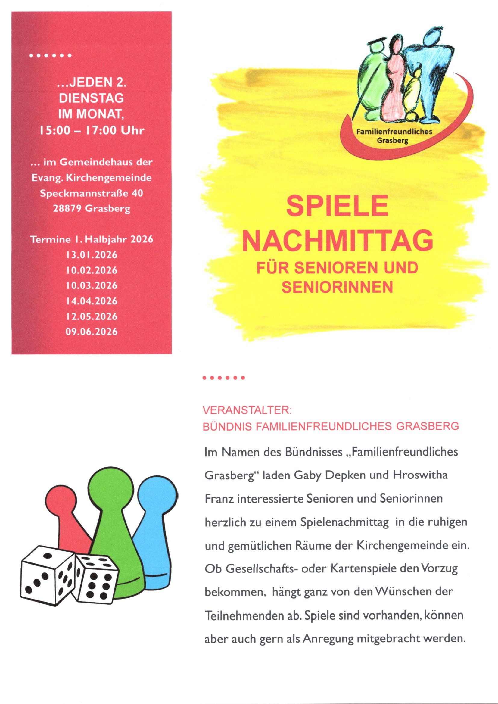 Im Namen des Bündnisses „Familienfreundliches Grasberg“ laden Gaby Depken und Hroswitha Franz interessierte Senioren und Seniorinnen herzlich zu einem Spielenachmittag in den Saal des Gemeindehauses ein. Ob Gesellschafts- oder Kartenspiele den Vorzug bekommen, hängt ganz von den Wünschen der Teilnehmenden ab. Spiele sind vorhanden, können aber auch gern als Anregung mitgebracht werden.