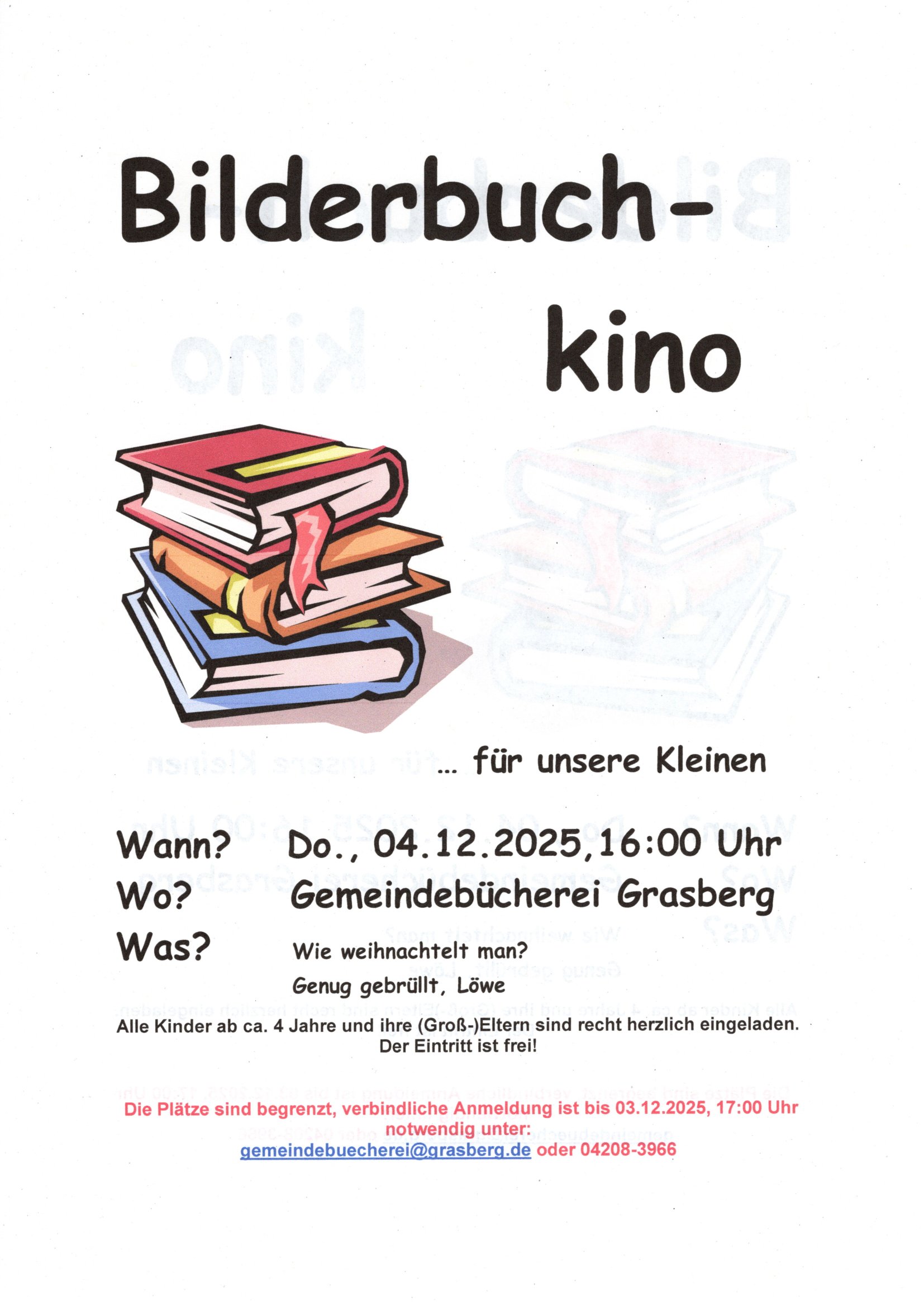 Das Bilderbuchkino findet immer am ersten Donnerstag im Monat (im Januar wird wegen des Jahreswechsels und der Ferien eine Ausnahme gemacht) um 16:00 Uhr statt und richtet sich an die Kleinen ab ca. 4 Jahre, die zusammen mit ihren Eltern oder anderen Begleitpersonen herzlich eingeladen sind. Es werden immer zwei Bilderbücher gelesen, deren Illustrationen mit Hilfe eines Beamers an die Wand geworfen werden, so dass sie von allen gleichzeitig betrachtet werden können. Der Eintritt ist frei.